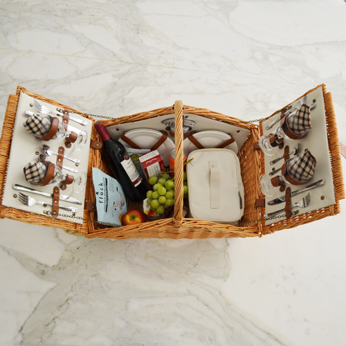 The Huntsman Picnic Basket has a traditional style. Hand crafted using full reed willow, this generously sized basket is made to last. Easy to pack, carry, and enjoy, it includes quality components including ceramic plates and glass wine glasses. Includes: (4) ceramic plates, glass wine glasses, stainless flatware, cotton napkins, (1) food cooler, insulated wine pouch, hardwood cutting board, spill proof salt & pepper shakers, wood handle cheese knife, stainless waiters corkscrew. Natural Willow with leather straps, closure, & hinge covers. Lifetime Warranty.