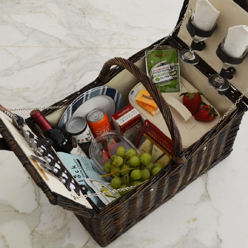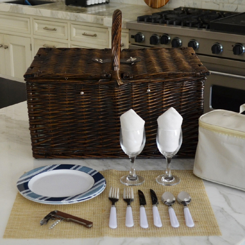 Traditional full reed willow handcrafted basket with a rich chocolate brown finish. It has a traditional picnic basket shape and convenient top carry handle. This set includes coordinating melamine plates and cotton napkins, glass wine glasses, stainless steel flatware, and corkscrew. Also includes a convenient food cooler.