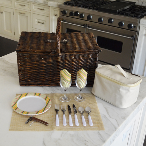 Traditional full reed willow handcrafted Picnic basket for two with a rich chocolate brown finish. It has a traditional picnic basket shape and convenient top carry handle. This set includes coordinating melamine plates and cotton napkins, glass wine glasses, stainless steel flatware, and corkscrew. Also includes a convenient food cooler.