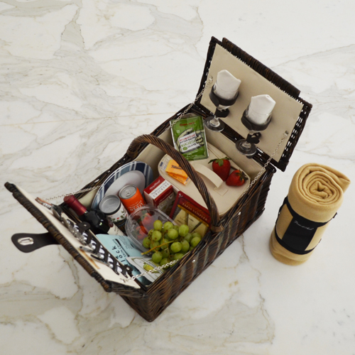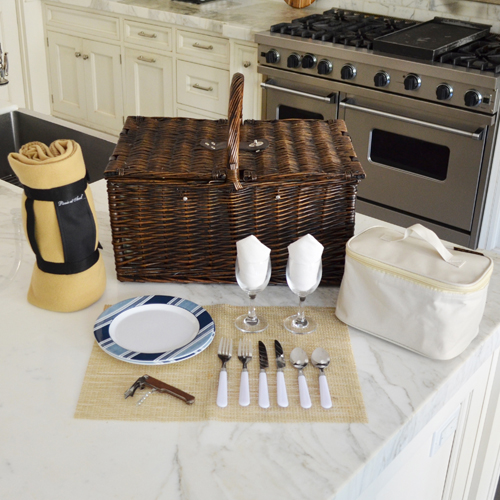 Traditional full reed willow handcrafted Picnic basket for two with a rich chocolate brown finish. It has a traditional picnic basket shape and convenient top carry handle. This set includes coordinating melamine plates and cotton napkins, glass wine glasses, stainless steel flatware, and corkscrew. Also includes a convenient food cooler and 50"x 60" fleece blanket with carrier.