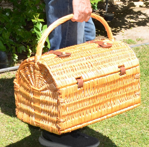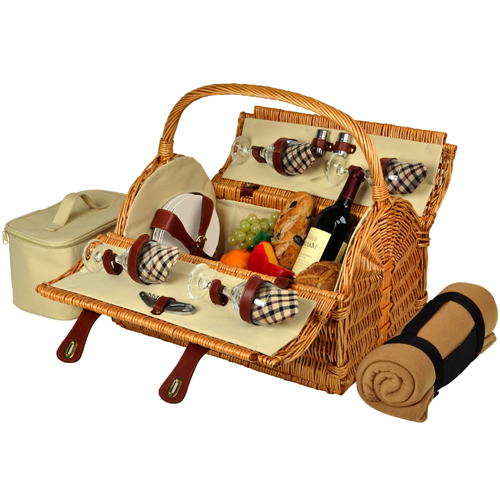 Unique hand crafted deluxe picnic basket in full reed willow with attractive dome top shape & top carry handle. Includes a premium picnic set for four with ceramic plates, matching cotton napkins, glass wine glasses, stainless steel flatware, corkscrew, and no spill salt & pepper shakers. Also includes a convenient food cooler and 50" x 60" fleece blanket with carrier.