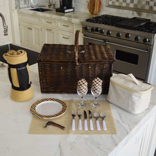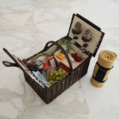 Traditional full reed willow handcrafted Picnic basket for two with a rich chocolate brown finish. It has a traditional picnic basket shape and convenient top carry handle. This set includes coordinating melamine plates and cotton napkins, glass wine glasses, stainless steel flatware, and corkscrew. Also includes a convenient food cooler and 50"x 60" fleece blanket with carrier.