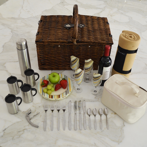 Traditional full reed willow handcrafted Picnic basket for four with a rich chocolate brown finish. It has a traditional picnic basket shape and convenient top carry handle. This set includes coordinating melamine plates and cotton napkins, glass wine glasses, stainless steel flatware, and corkscrew. Also includes a convenient food cooler, coffee set with stainless steel coffee flask and mugs, and 50"x 60" fleece blanket with carrier.